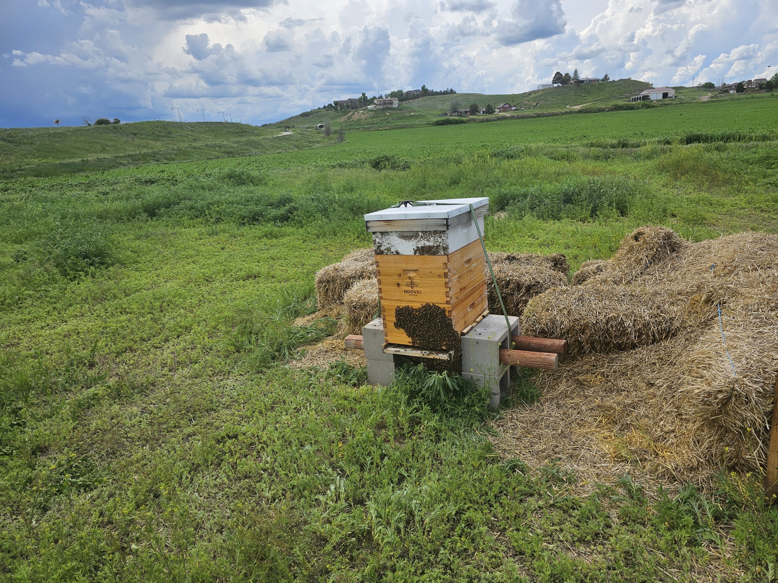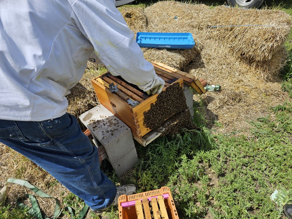 The inside was FULL of bees and it was a hot day so they were doing what is called BEARDING. That means it is starting to gett too hot and humid inside so the colony has some of the workers go outside making more room to move air inside to cool the hive. Nothing to be alarmed about. We’ll give them a bit more room inside by adding a third box called a medium (or a super). This box will normally just hold honey that be harvested later. The gentleman in the picture is Stan Jones from the Brighton Bee Club.