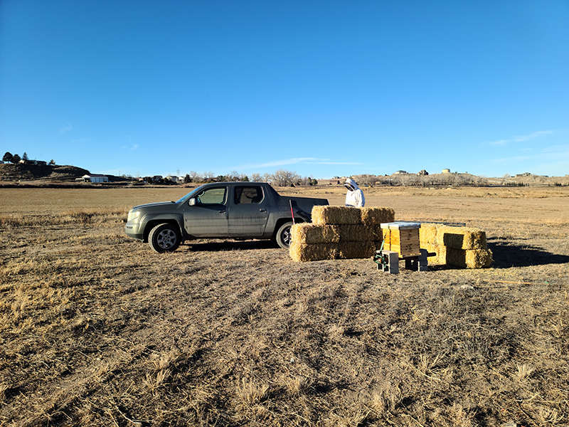 December 11th, 2022 was a big day for our bees! That’s the day that they were transported from Dan Rau’s apiary to their current site just south of the Adams County Animal Shelter. If you enter the park from 120th Ave, you’ll see them on your left (west side) protected from the winds by bales of straw. That’s Dave Swanson by the truck. He was kind enough to assist with the move.